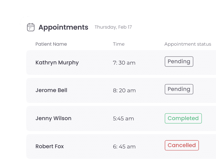 Easily add and manage staff with role-based access controls for doctors, nurses, physios, and admin teams.