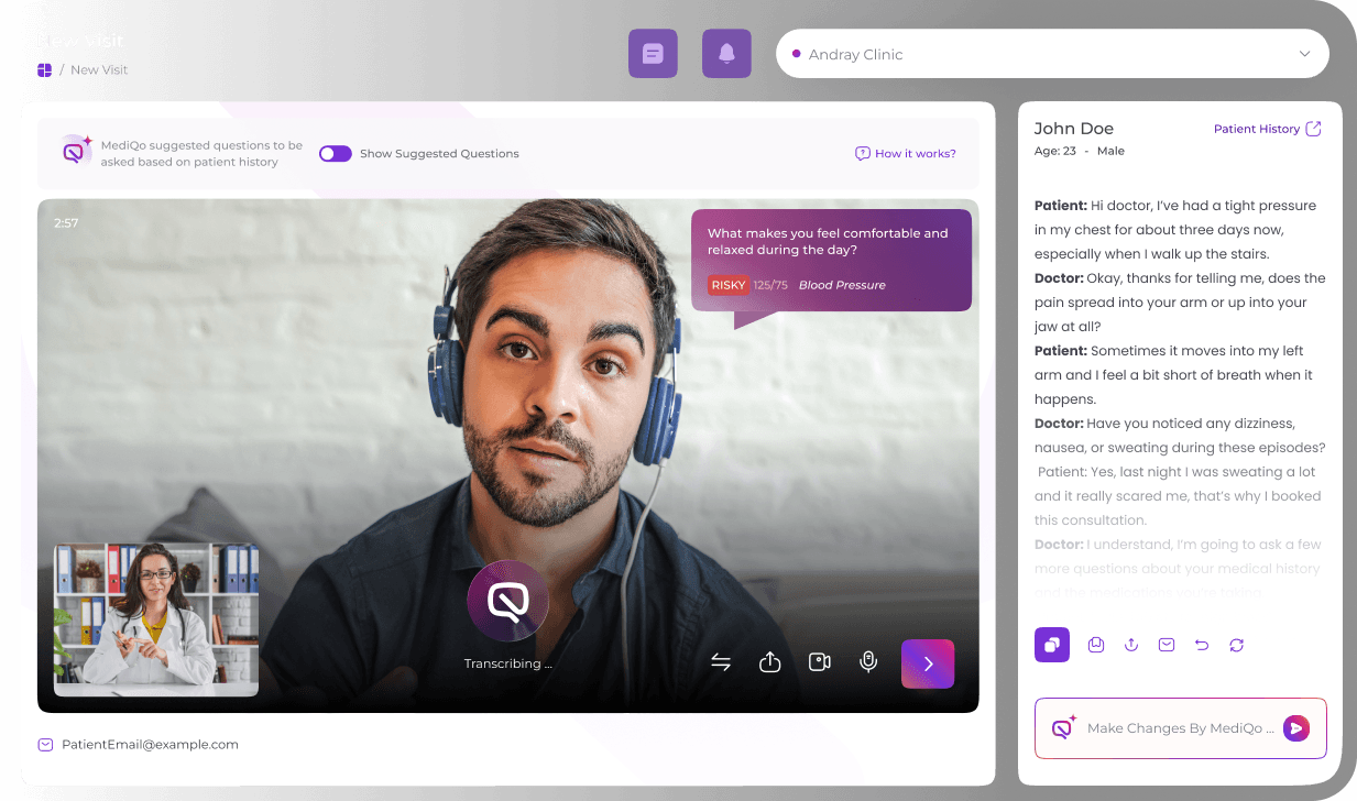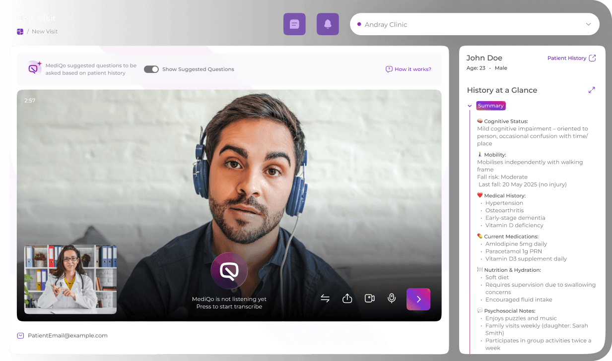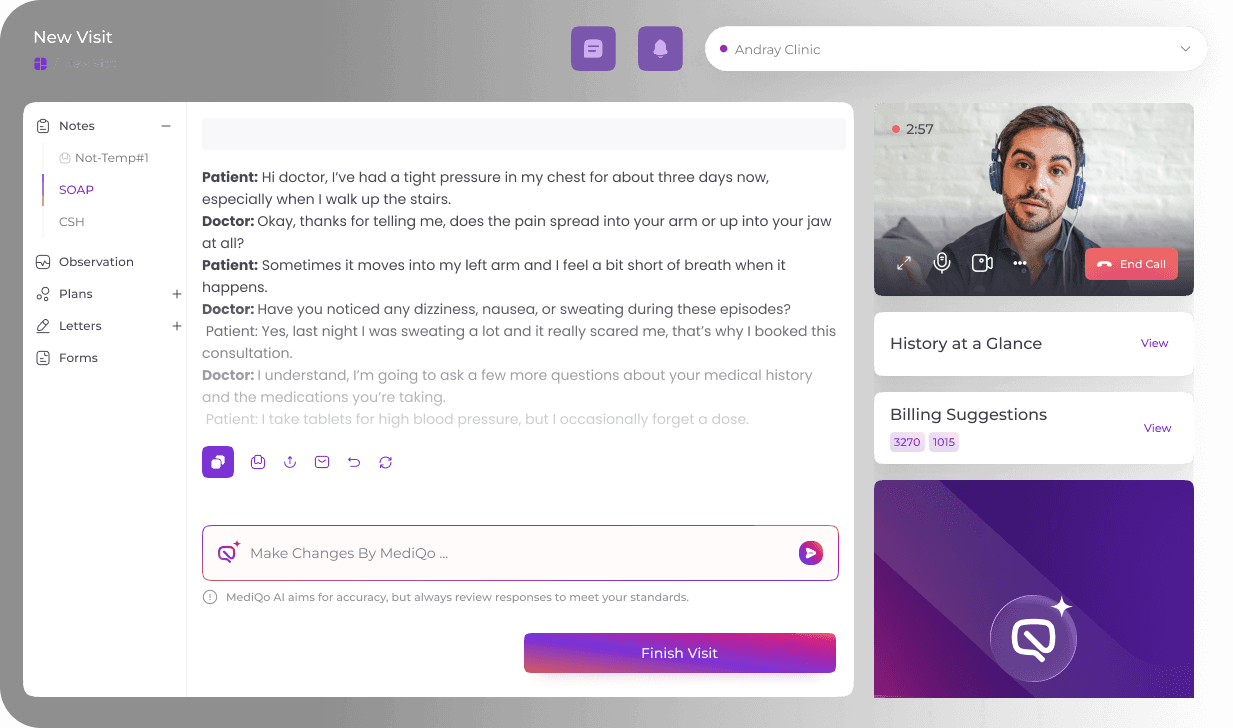 MediQoโs AI Scribe listens only when activated and generates clear, structured clinical notes instantly. Whether in person or during a telehealth call (even with a headset), MediQo removes hours of admin and ensures every consultation is documented accurately.