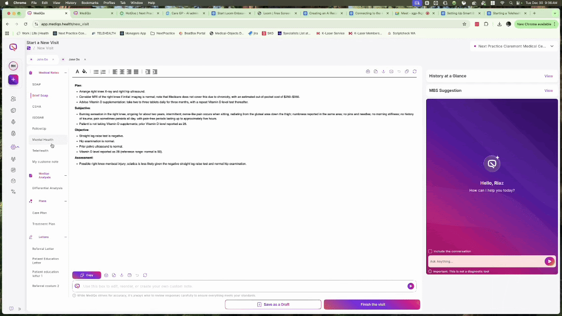 While in a consultation, navigate to the menu on the left-hand side of the screen and click on Differential Analysis. The system will automatically populate this section based on the current patient context and consult history.