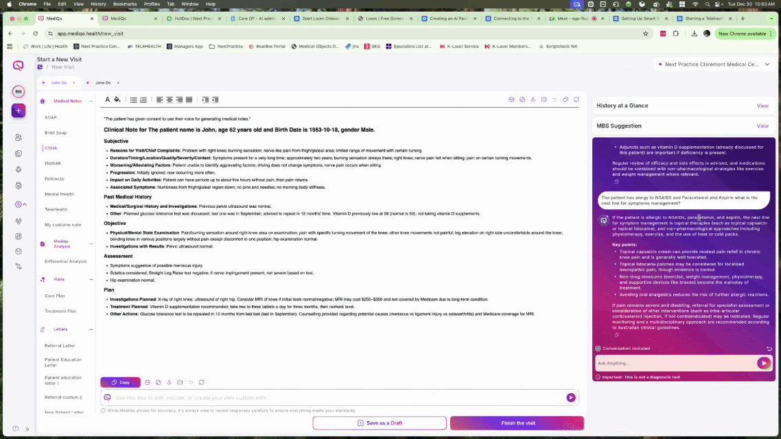 To view a comprehensive record, click the View History button (or history icon) in the top right corner. This displays detailed encounters, including medical notes, Medico analysis, care plans, treatment plans, and letters.