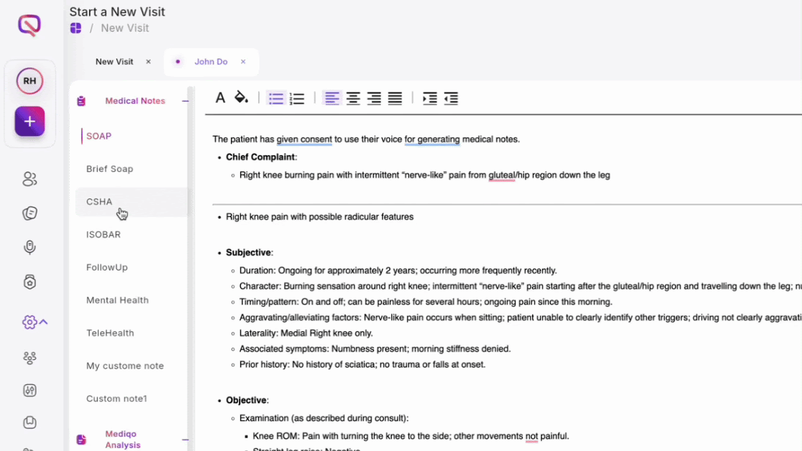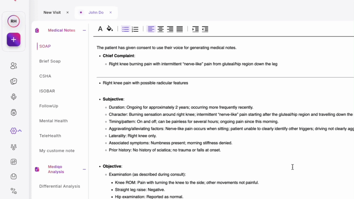 MediQo automatically generates medical notes in the background during your consultation. You can choose from various standard formats like SOAP or Brief SOAP directly from the sidebar.