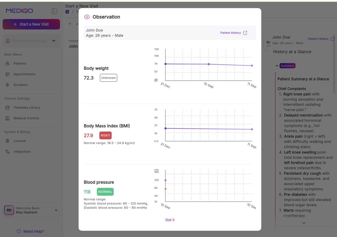 When you’re in a patient consult, MediQo automatically extracts observation data from consultation audio, records and charts historical values, displays longitudinal trends in real time and flags readings as normal or risky, assisting with follow-up. There’s no manual data entry required.