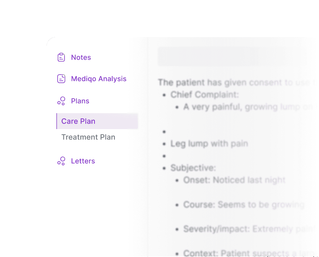 MediQo automatically generates education-based care plans and treatment plans based on patient context, objectives, risk factors and clinical best practice — helping clinicians save time, stay compliant and deliver consistent, patient-centred care.