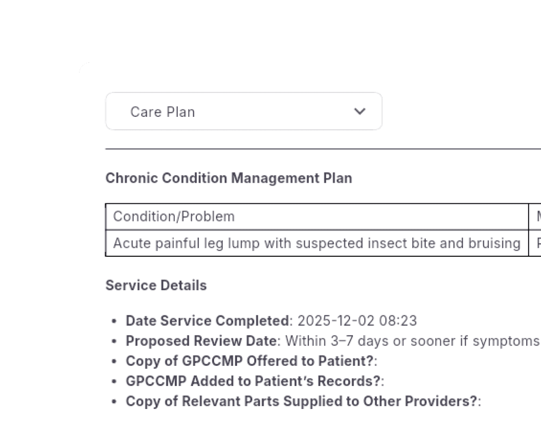 Plans incorporate conditions, goals, symptoms, medications, red flags, past visits and objective findings. Complete structured care plans in minutes — accurately, consistently, and fully compliant.