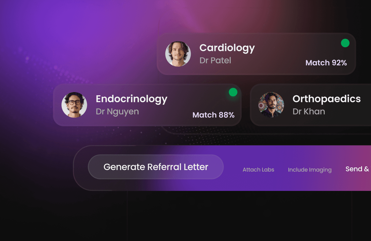 Automatically create structured, professional referral letters using patient data and consult context, ready to download, send, or upload to your PMS.