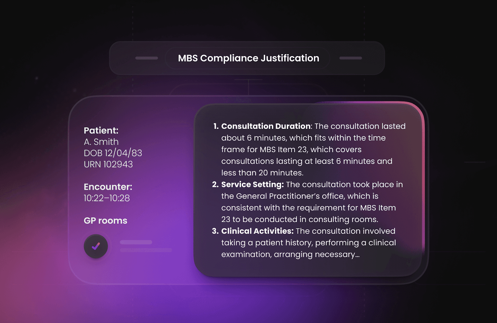 Receive real-time MBS item number recommendations based on consult context and documentation, helping maximise revenue and reduce compliance risk.